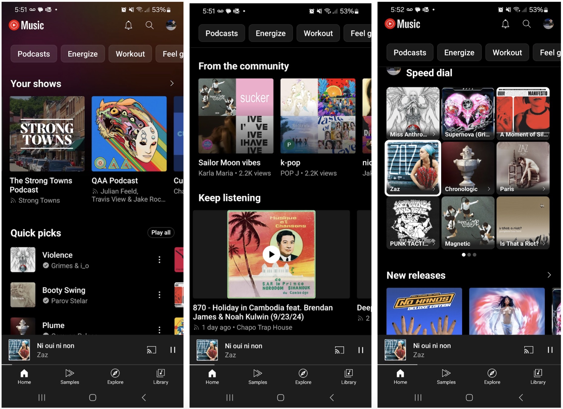 Let’s talk first about user experience. Despite how obtuse my formative listening routine was, it was fairly streamlined – nothing took me out of the process. Download, extract (close WinRAR popup), listen. Streaming, for its alleged convenience, complicates this. I use YouTube Music. Every time I open the app, I am immediately bombarded with a user interface that looks like this.