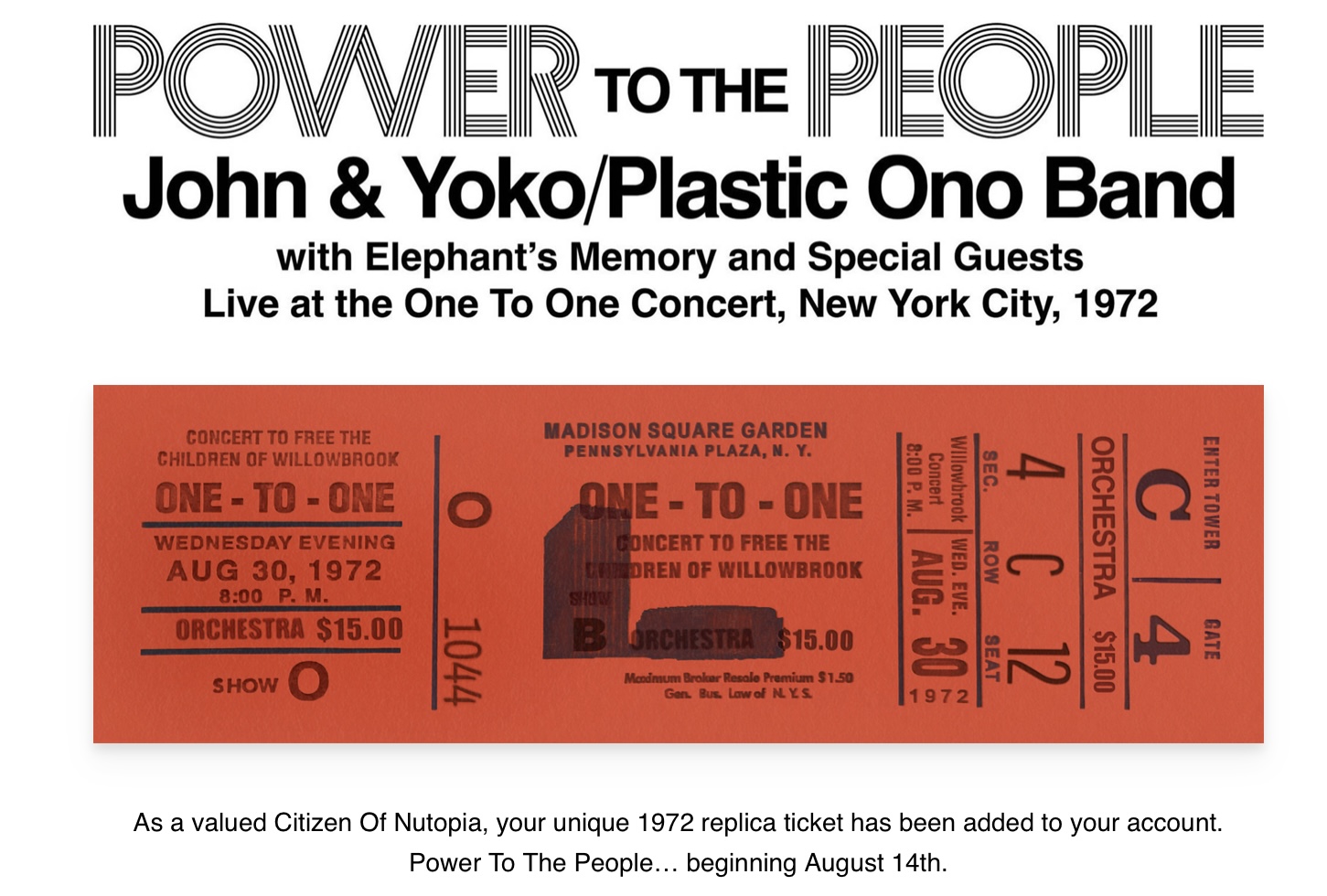 On August 12, 2025, Nutopia arose again, as the Lennon estate’s email blast addressed the Citizens of Nutopia. Those who heeded the call were treated to a bespoke digital concert ticket modeled after the 1972 originals.