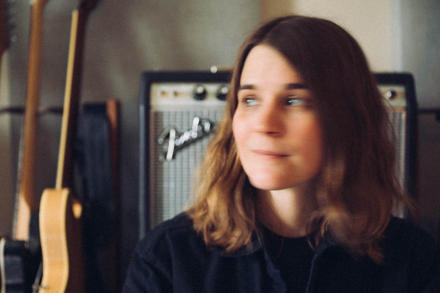 In the studio there was this incredible collection of instruments, and they’re arranged in such a way to sort of just like facilitate you like picking them up if you’re inspired, and where I’m sitting, I’m in front of a piano where you can see some other keyboards and some softly glowing lamps. Josh had these string lights and there are other instruments scattered around the edges, or pushing up towards me.